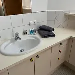器具でいっぱいの台所はこのベッドル-ムの1室のあるStudio 21Aアパ-トにあります. お客様は1室のバスル-ムを利用できます.